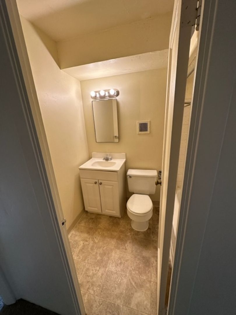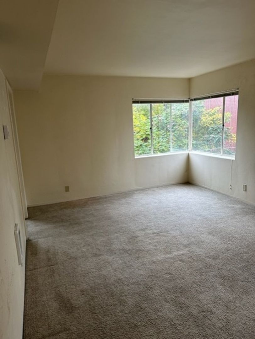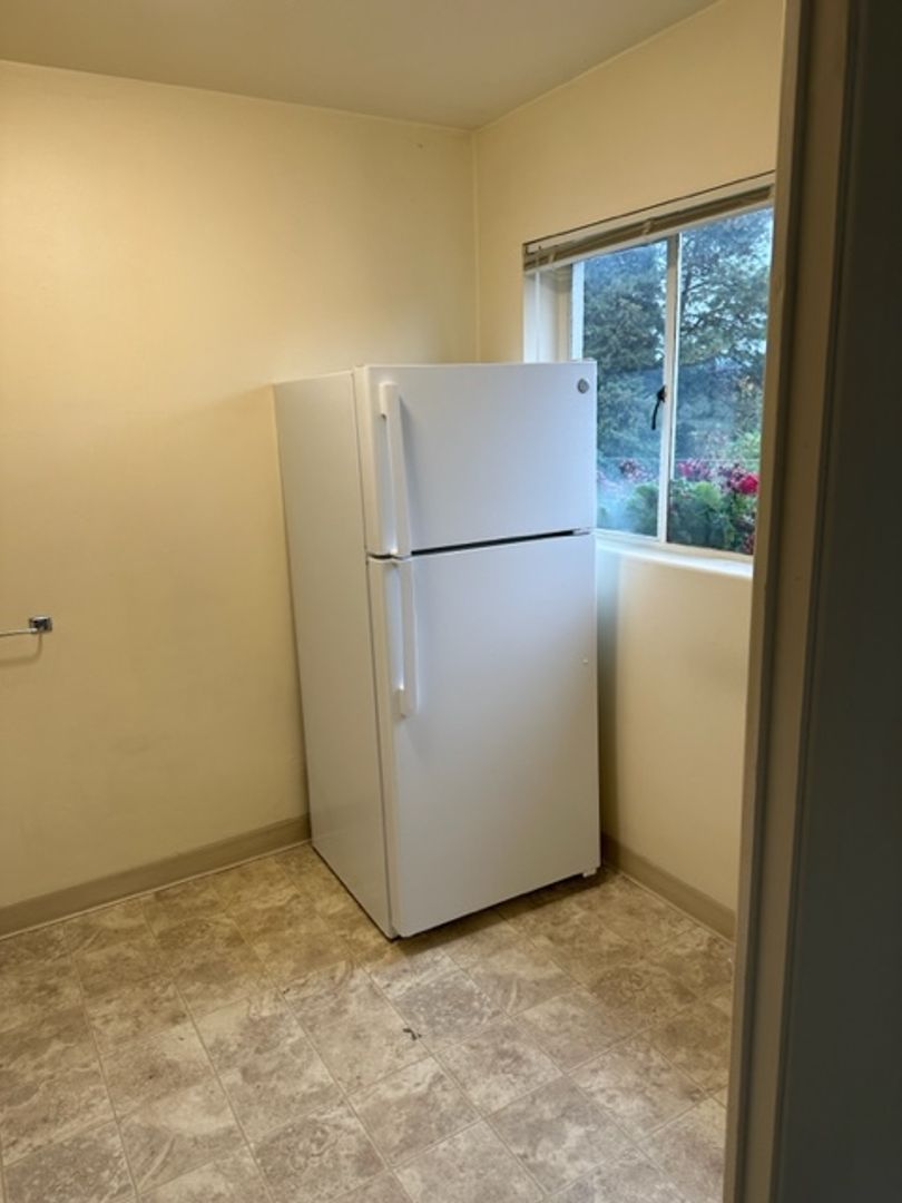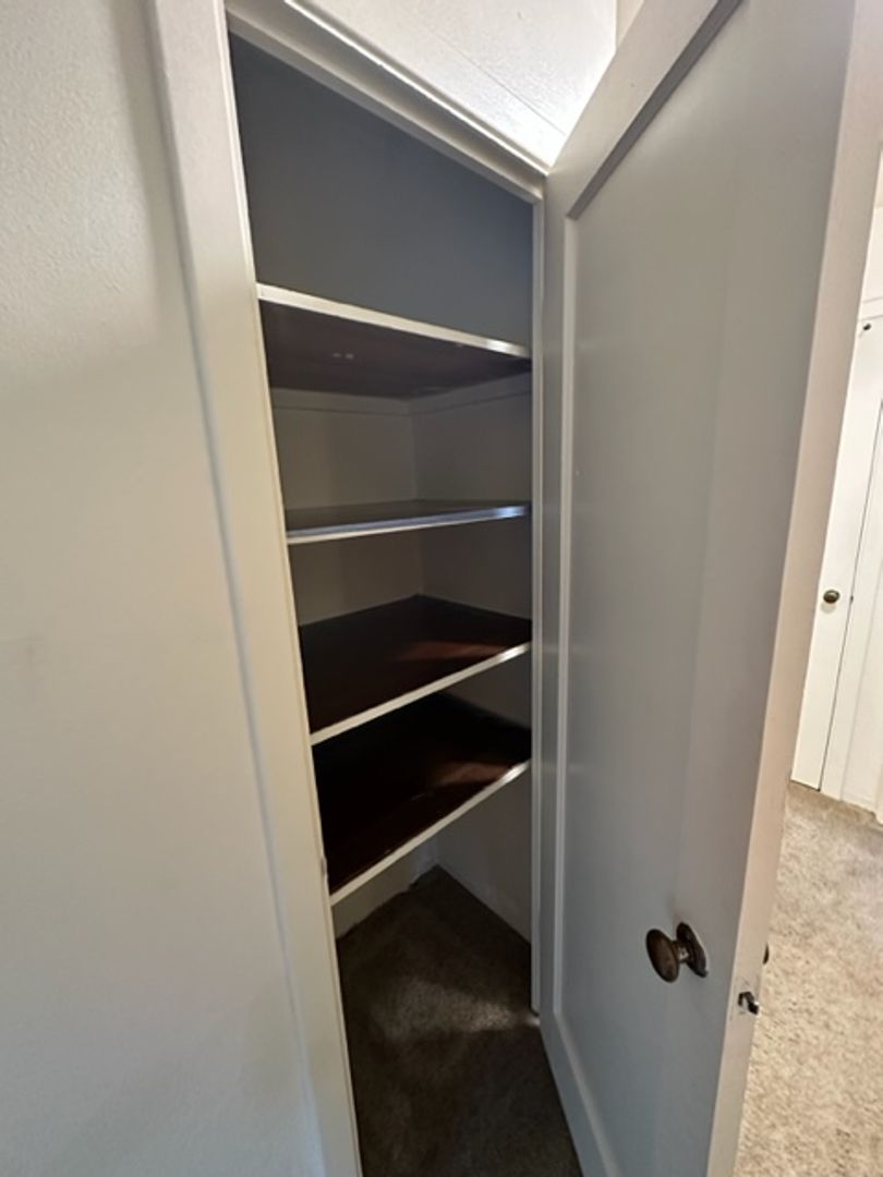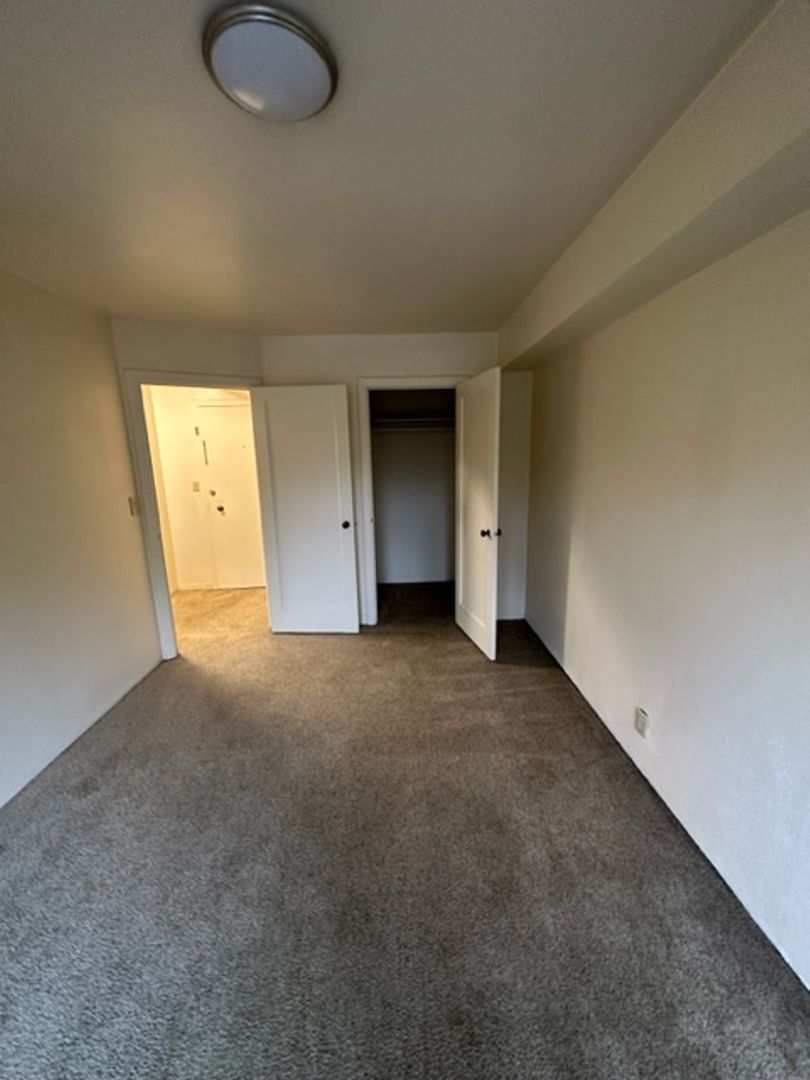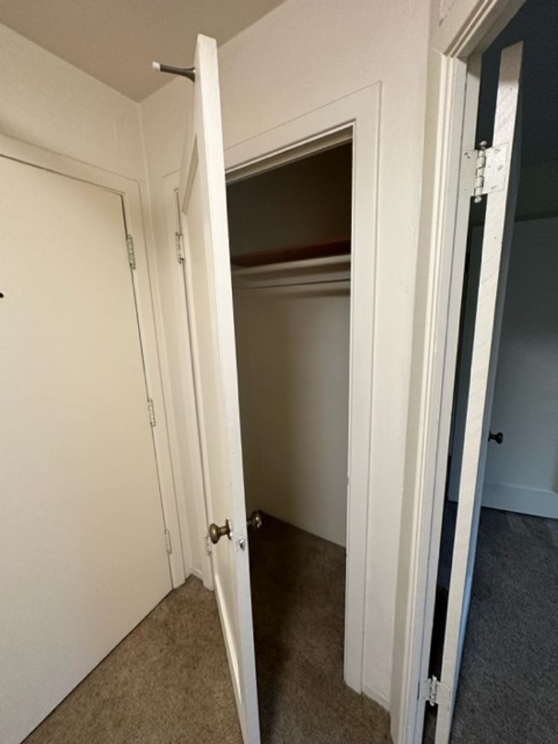 With 548 sq ft of space, the layout is smart and functional: the bedroom fits a queen bed, dresser, and desk with ease. Storage is a highlight, with a walk-in bedroom closet, a coat closet at the entry, and a linen closet in the hallway.