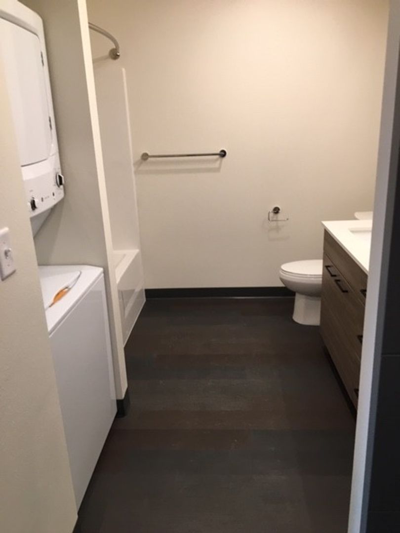 Washer and dryer stackable unit conveniently located in the bathroom.