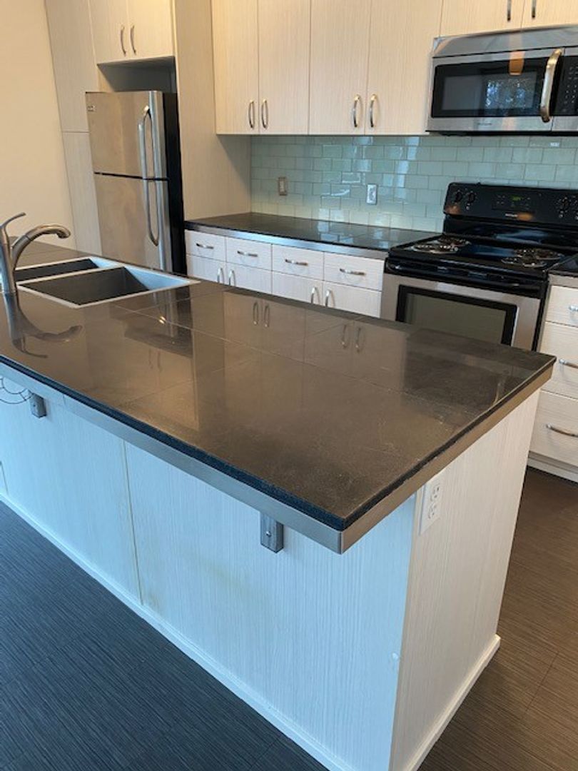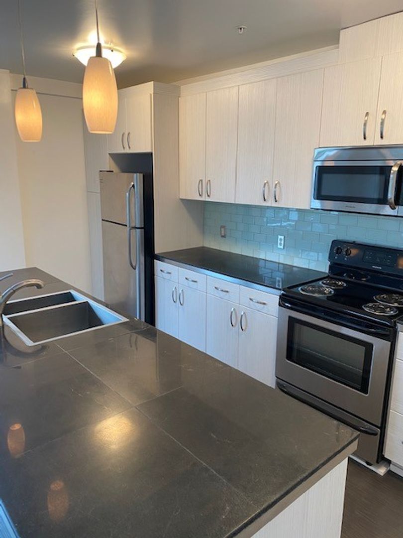 This spacious downtown apartment located on the third floor of the building has tons of natural light and modern features. The kitchen features a large island and full kitchen appliances including a new refrigerator! Great for roommates, each bedroom opens into its own private bathroom suite with full tub and shower.