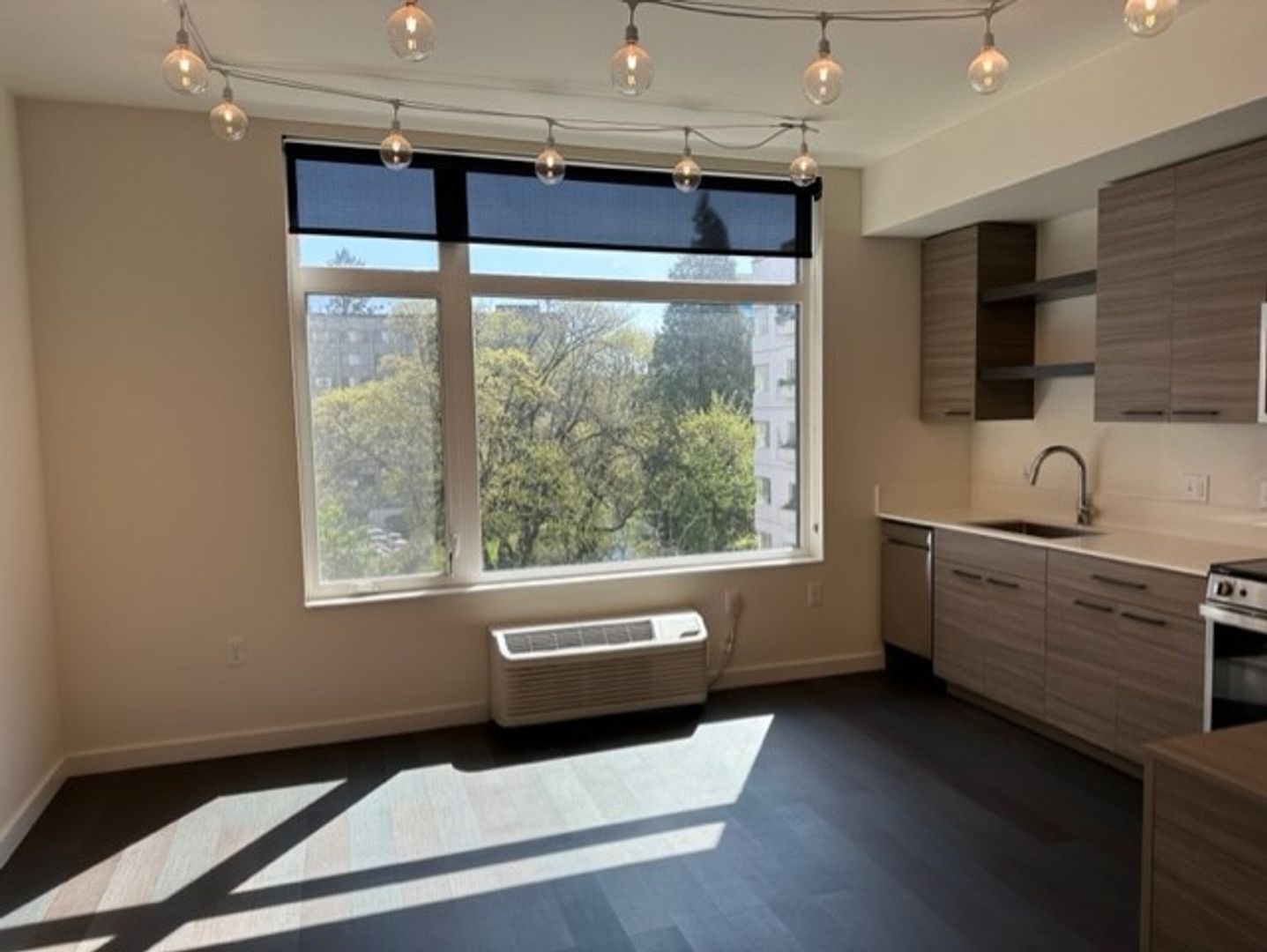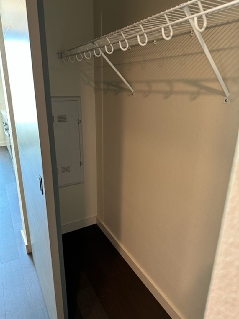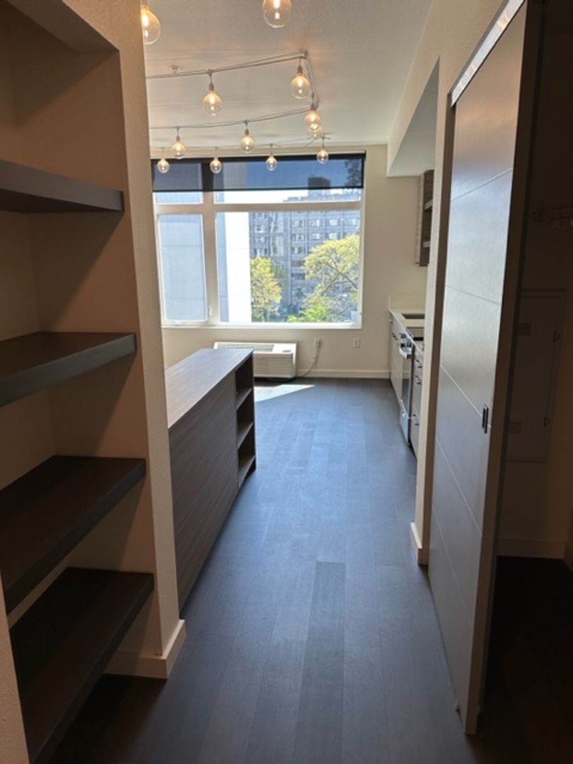 This private studio unit features heating and air conditioning in main room, Stainless steel appliances including dishwasher, quartz countertops in kitchen and bathroom, as well as a washer / dryer stackable unit in bathroom. A built in room divider with shelves for storage provides a private area for the bedroom, and there is a built in book case in hallway. With the addition of a large closet, there is plenty of storage. A stylish sliding barn door closes off the bathroom. The large windows allow tons of natural light and unique views of the Coburg Hills!