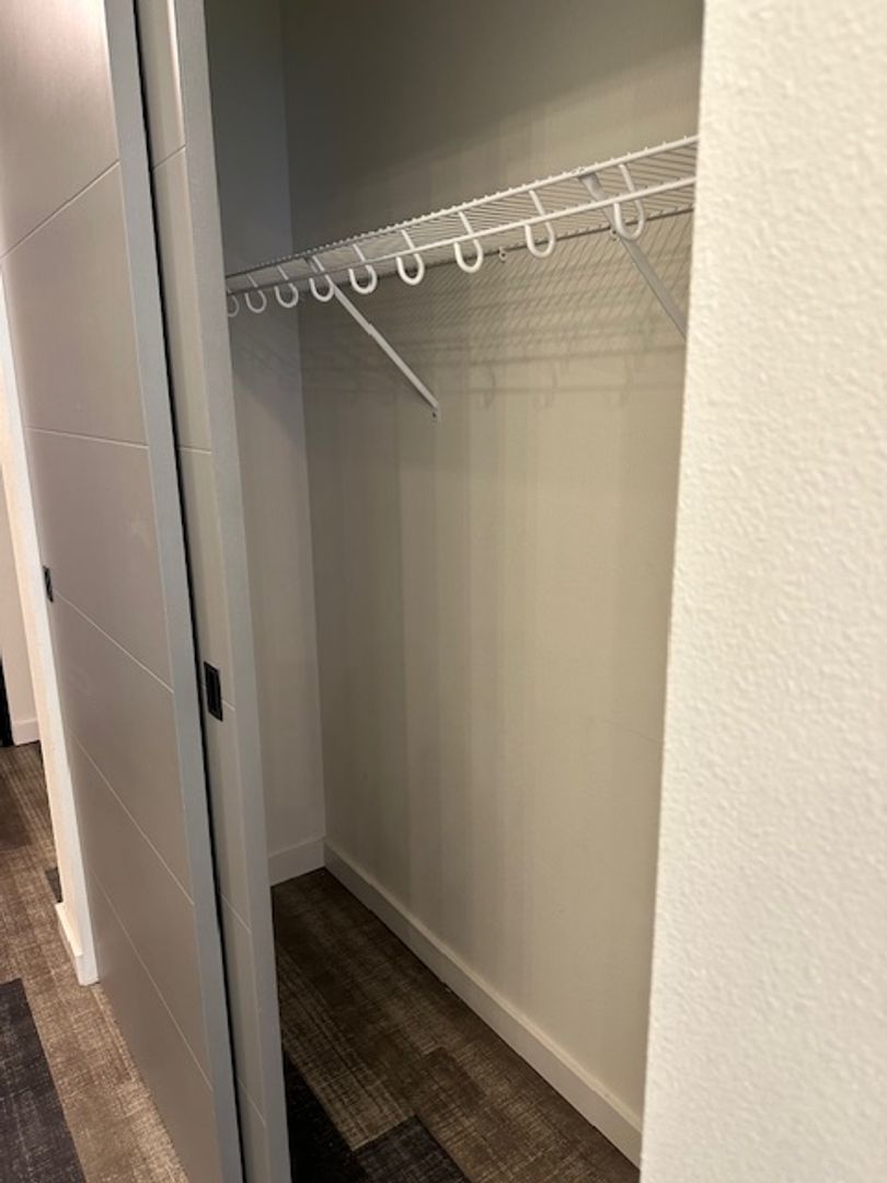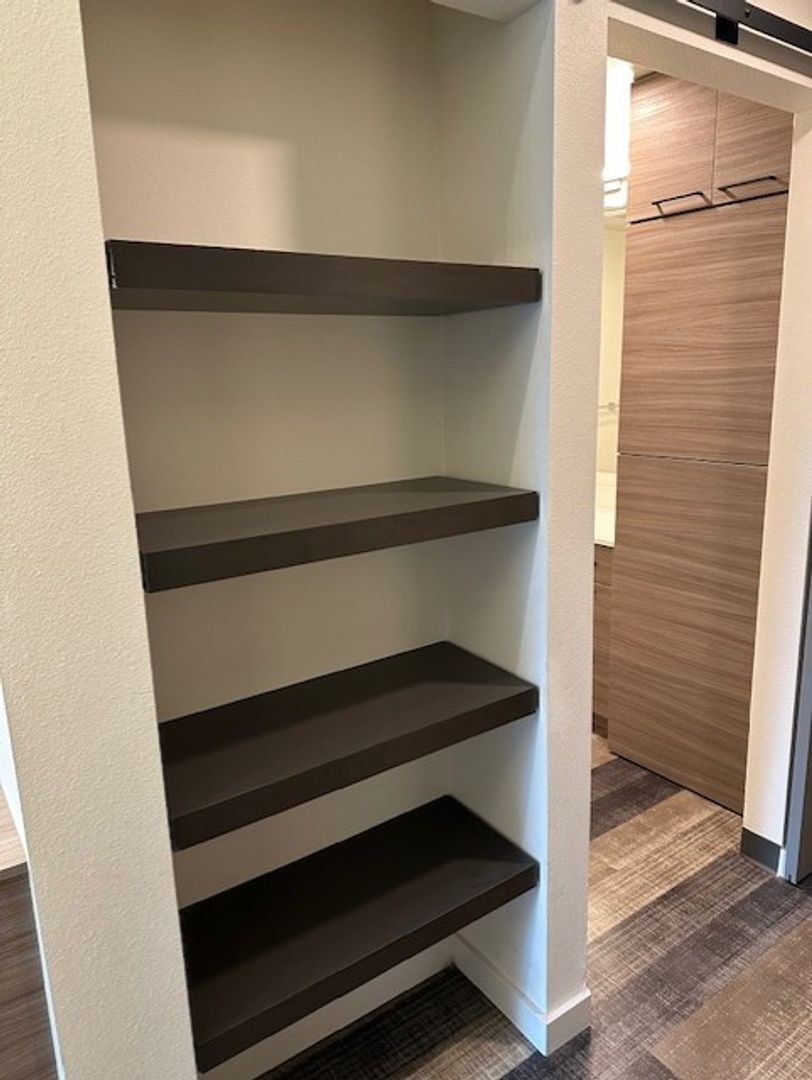 Private Studio Layout: Designed with a thoughtful use of space, this unit includes a built-in room divider with storage shelves, providing separation between the bedroom and living areas. A built-in bookcase in the hallway and a spacious closet offer ample storage solutions.