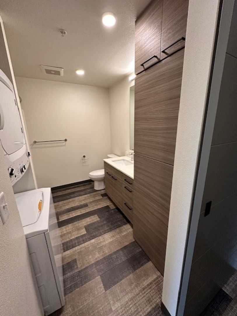 Washer and dryer stackable unit conveniently located in the bathroom.