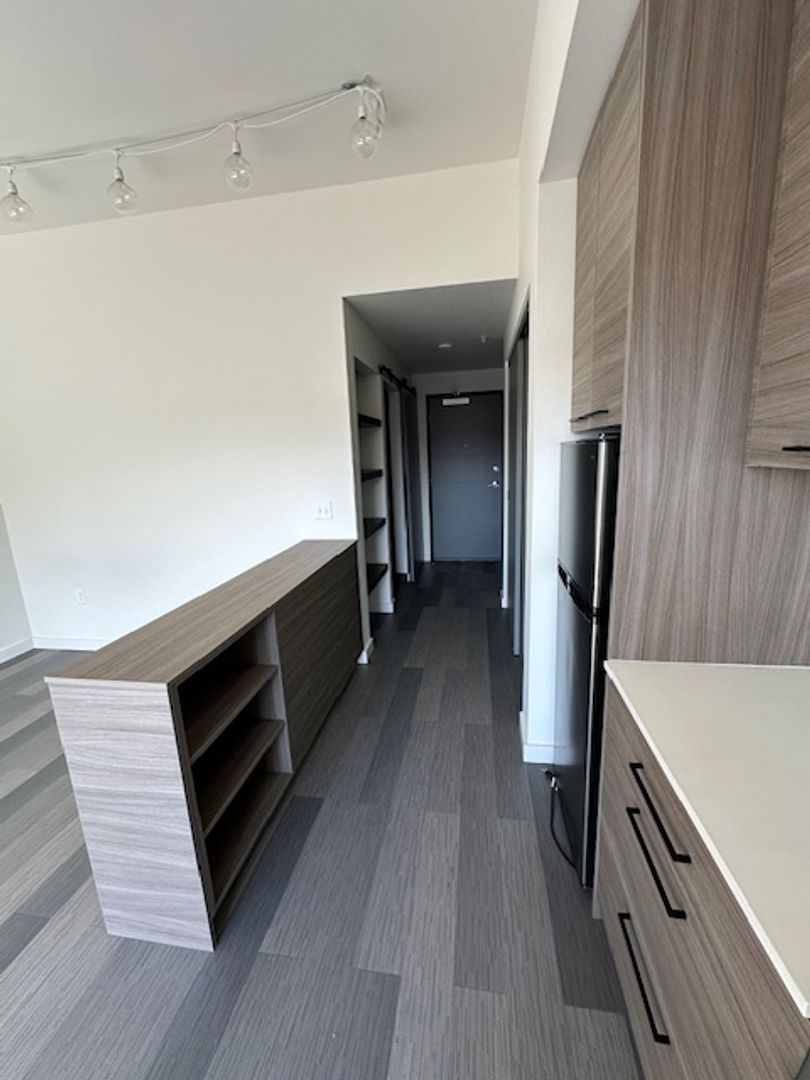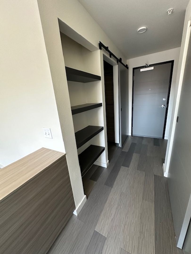Smart & Functional Layout – A stylish built-in room divider with shelving separates the sleeping area from the living space for added privacy. The hallway features a built-in bookcase, and a large closet provides plenty of storage.