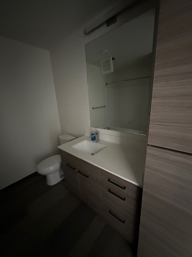 Stylish Bathroom – A sliding barn door adds a modern touch and enhances the apartment’s design.