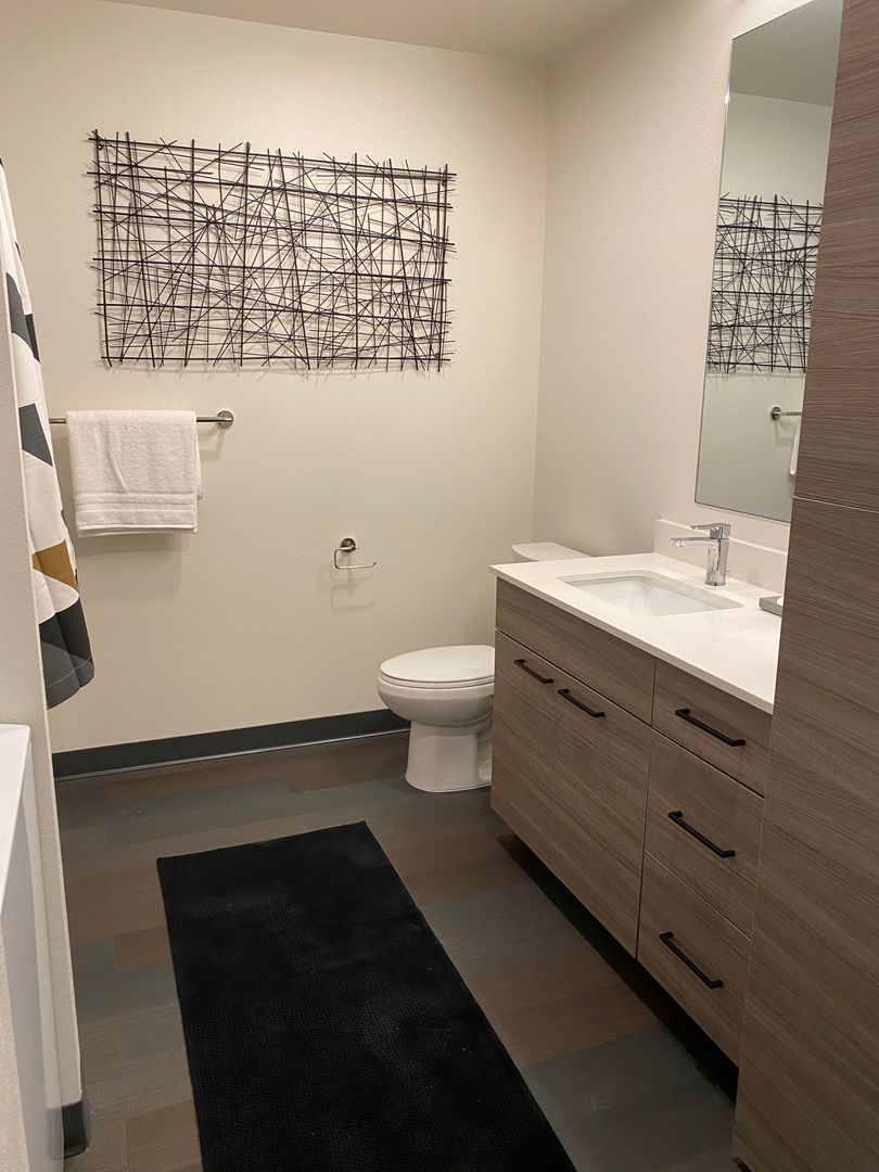 Stylish Bathroom – A sliding barn door adds a modern touch and enhances the apartment’s design.