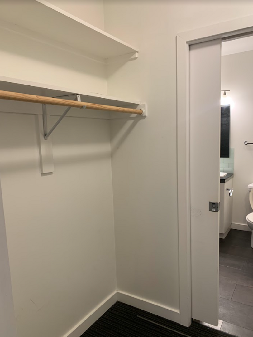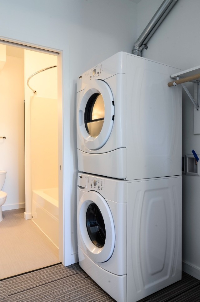 Stackable Washer & Dryer: Conveniently located in the shared hallway closet for easy access.
