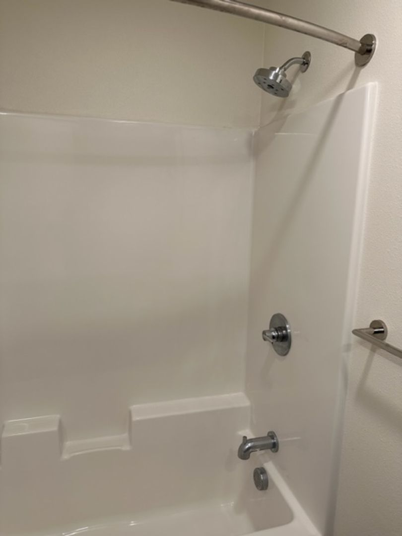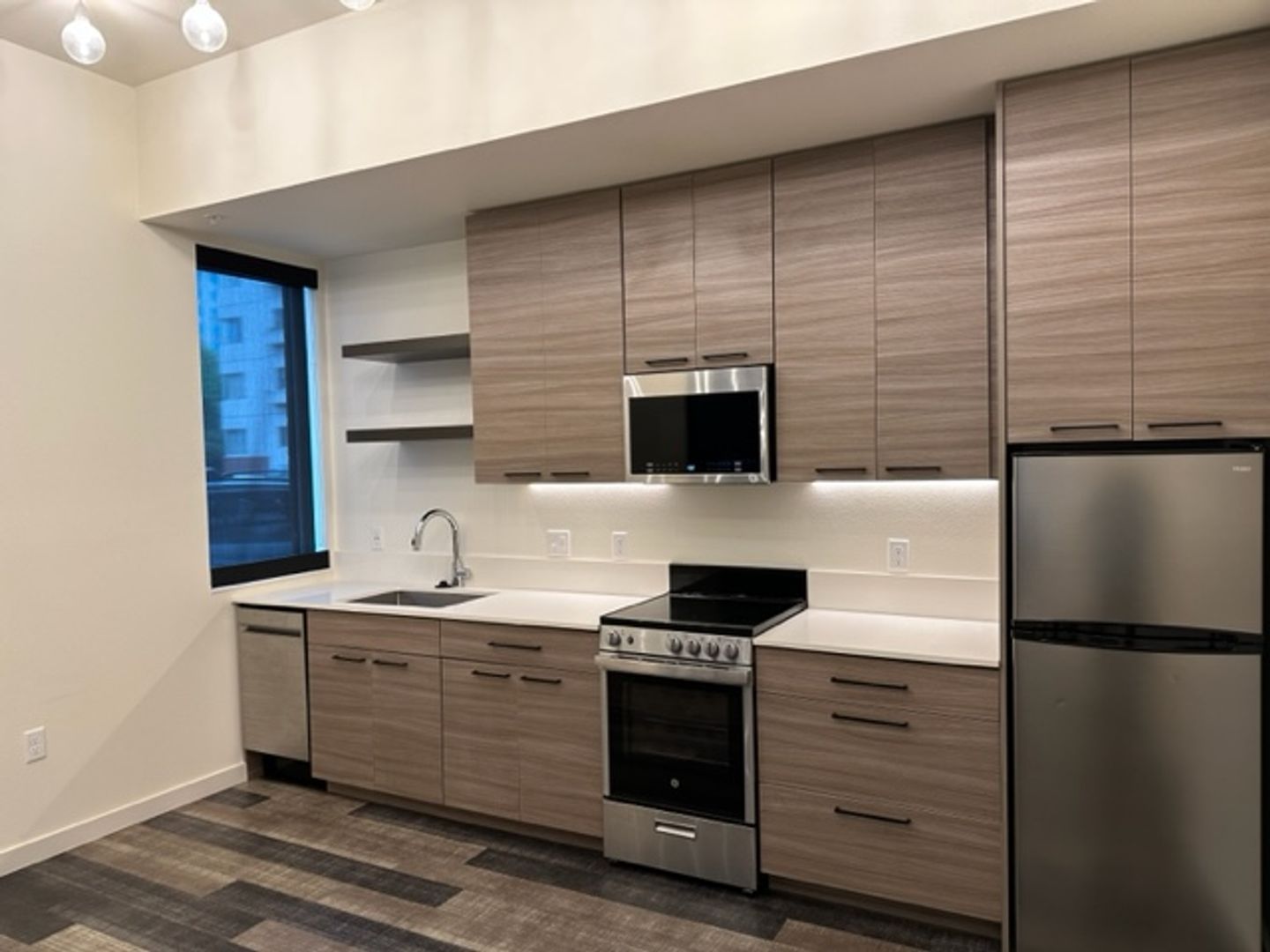Modern Kitchen – Enjoy stainless steel appliances, including a dishwasher, paired with sleek quartz countertops in both the kitchen and bathroom.